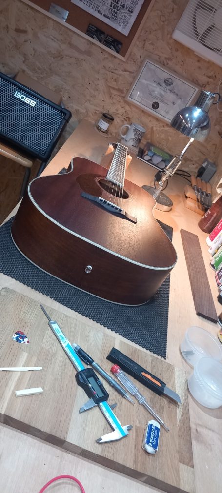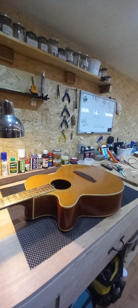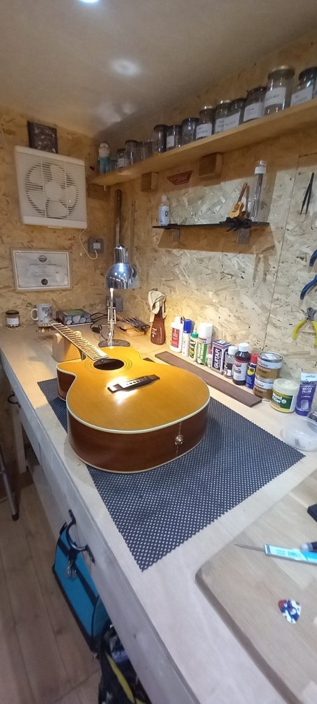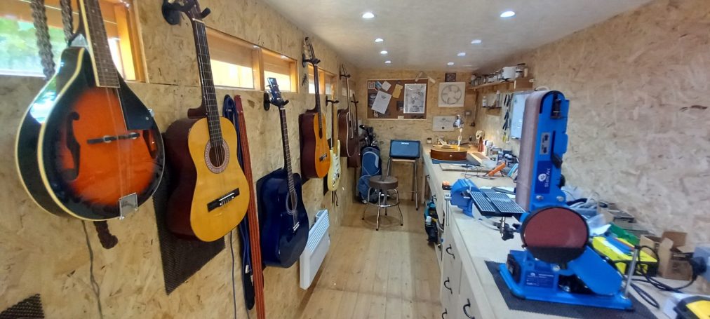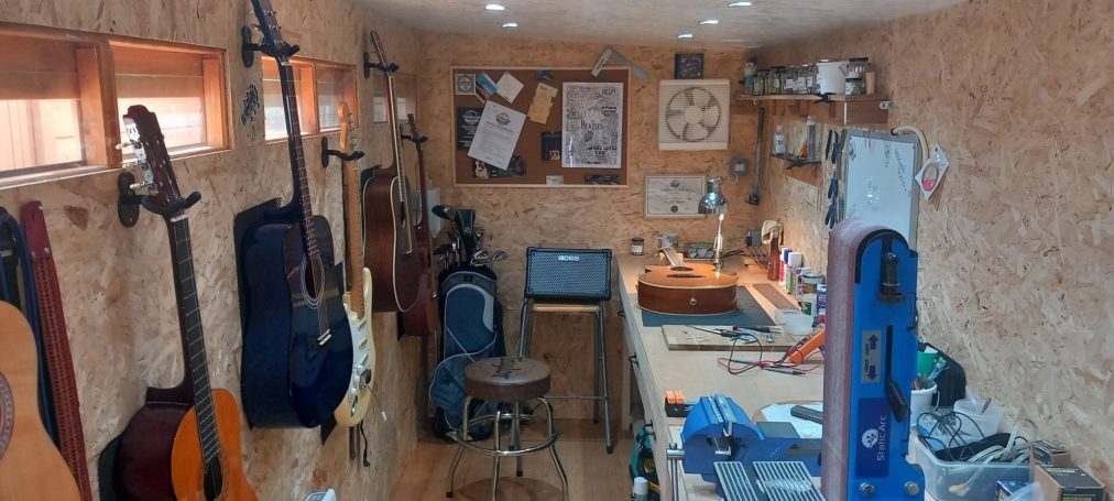 Our workshop is at my home in Hatfield Hertfordshire. I was proud to spend the summer of 2024 building a purpose built workshop that is designed to specifically cater for my enthusiasm to get those silent guitars singing again!